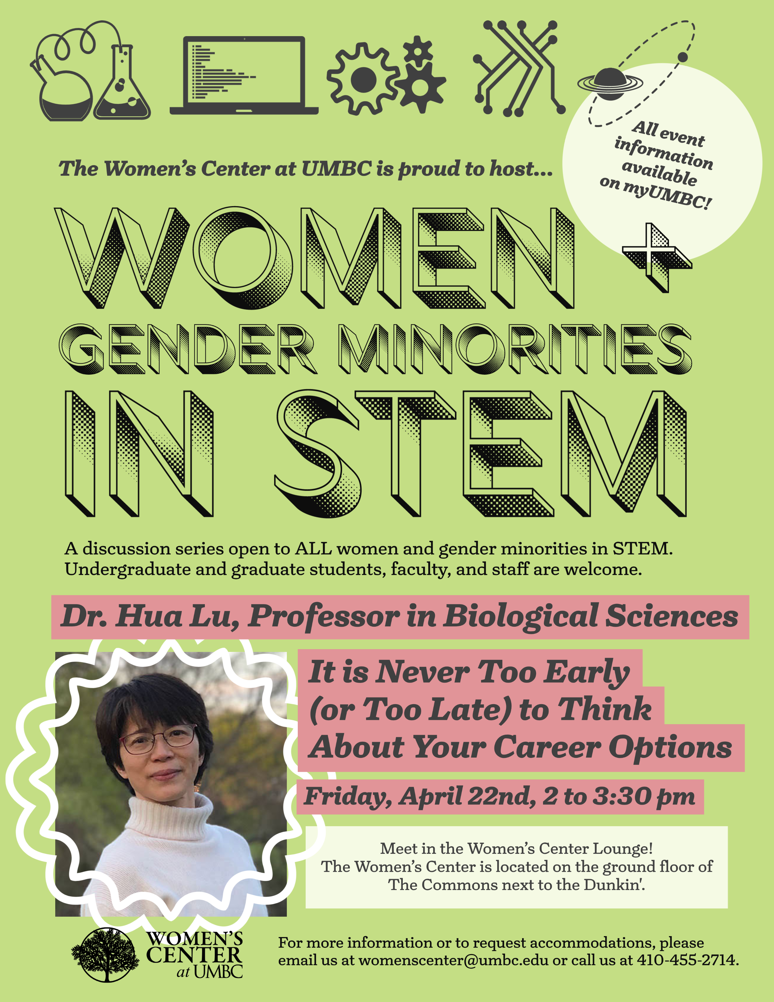 This event is part of the Women's Center's Women + Gender Minorities in STEM Discussion Series.This series is dedicated to creating space for women and gender minorities in STEM within our Women’s Center community. More discussion topics will take place throughout Spring 2022. Guest speakers are staff and faculty in STEM fields at UMBC.