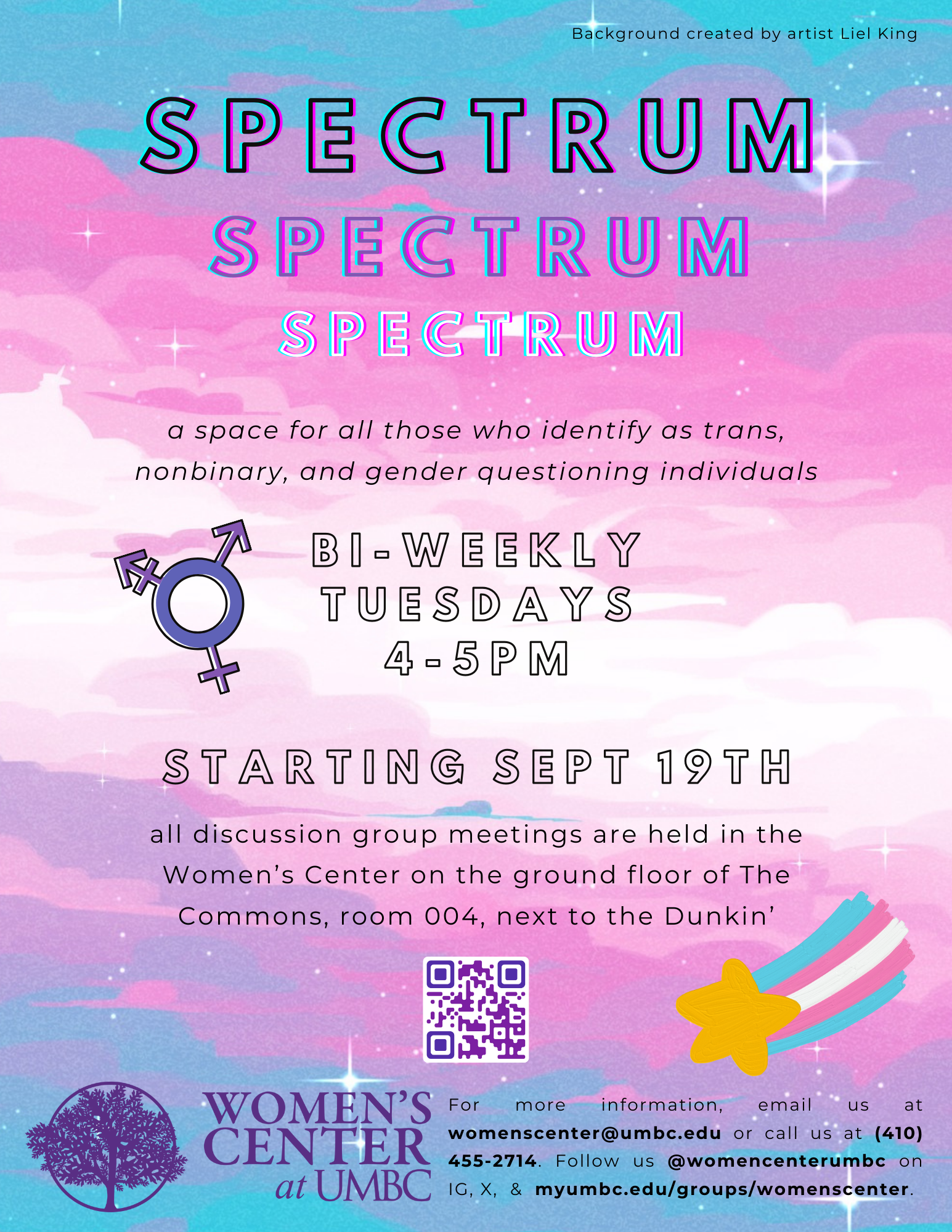 The Spectrum Discussion Group makes space for UMBC community members who identify as trans, genderqueer, gender fluid, outside of the gender binary, and/or those who are questioning their gender identity.