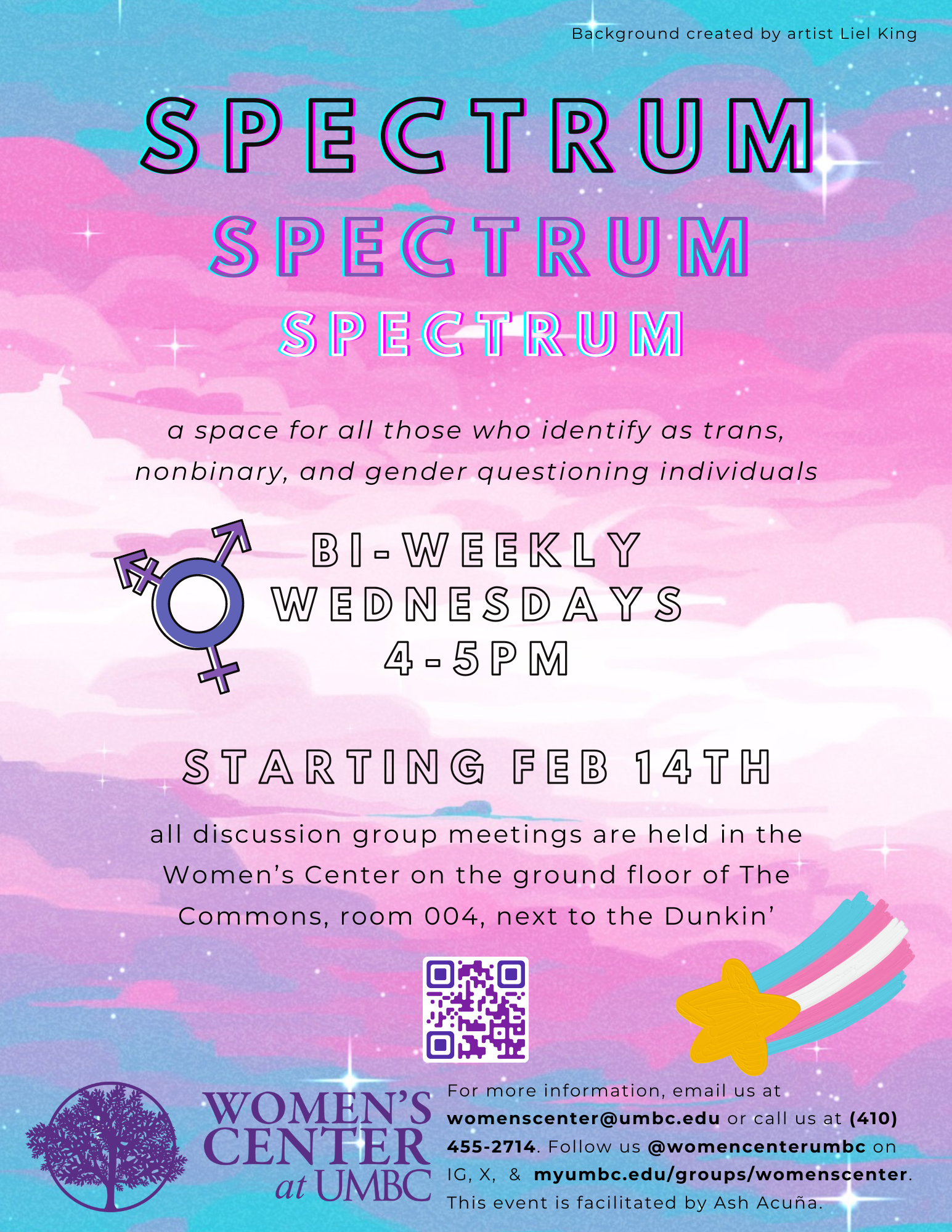 The Spectrum Discussion Group makes space for UMBC community members who identify as trans, genderqueer, gender fluid, outside of the gender binary, and/or those who are questioning their gender identity and those who are allies, regardless of their sex, gender, sexual orientation, gender identity, or gender expression. This discussion-based program follows the Women’s Center Brave Space model to provide a welcoming environment and thoughtful community to engage in conversations focused on the experiences of the transgender community.