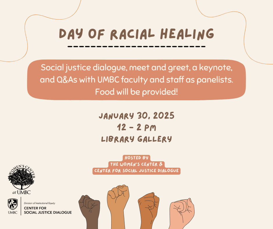 Join The Women's Center and the Center for Social Justice Dialogue for a facilitated conversation in recognition of the National Day of Racial Healing. The event will include a mix-and-mingle, a keynote address, and a question-and-answer session with UMBC faculty and staff as panelists. Food will be served.