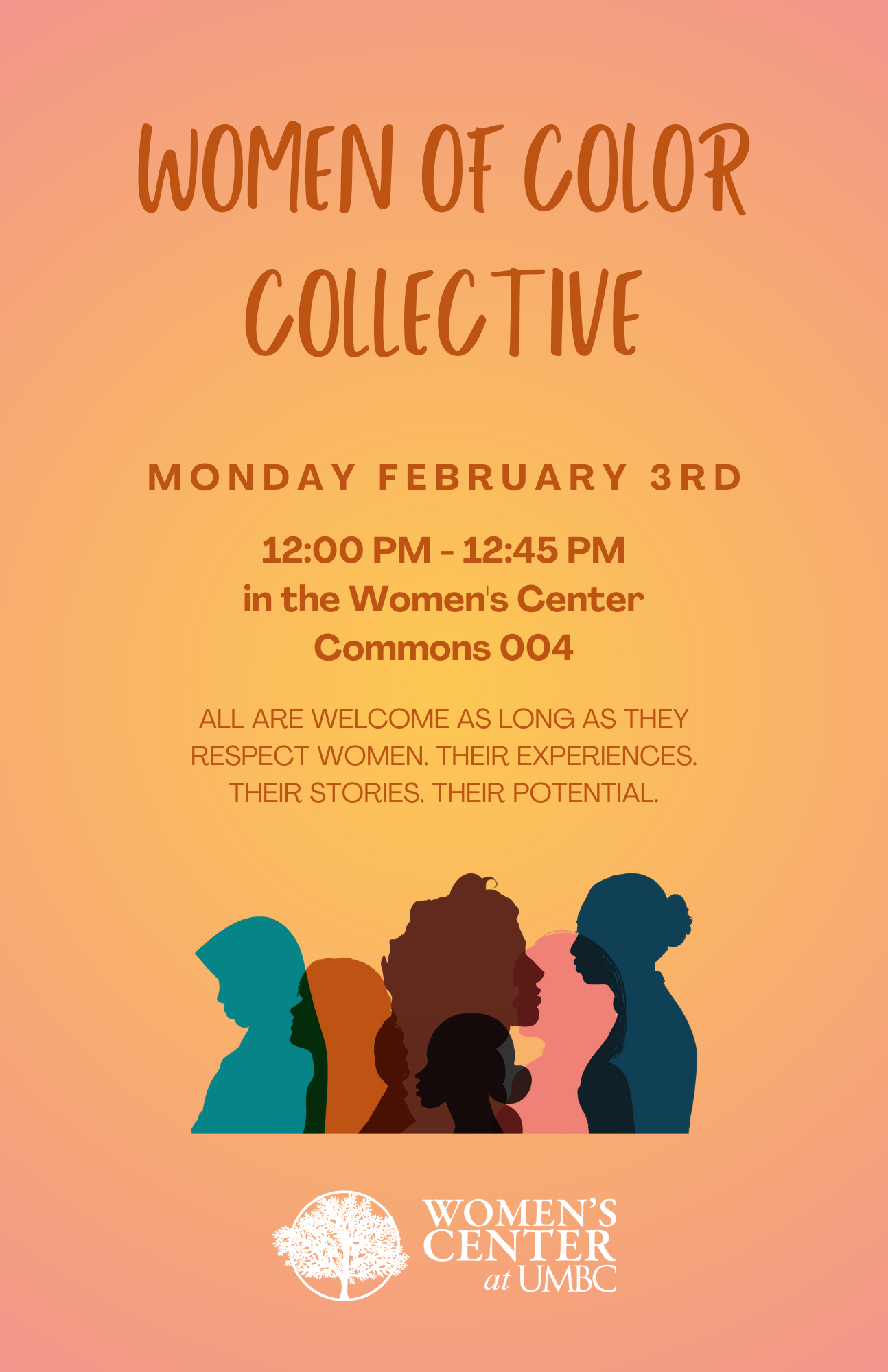 WOCC will take place in person in the Women's Center, biweekly throughout the Spring semester. If you would like to receive reminders and details about the meetings, please follow our myUMBC and Instagram pages.