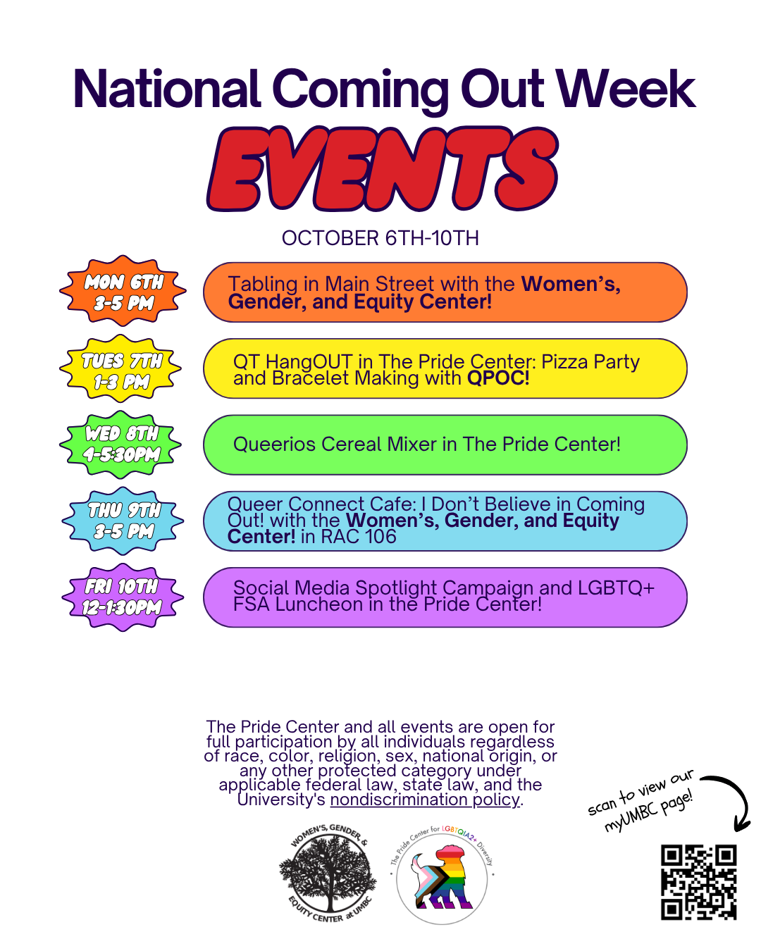 Stop by Commons Main Street (outside the bookstore) between 3 to 5 October 6th to talk to the WGEC and Pride Center staff about National Coming Out Week! We will have stickers, flyers, a photobooth, and an interactive poster!