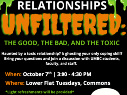 It is common to feel confused about topics like boundaries, expectations, and communication. Relationships are complicated! Bring your questions and join a discussion with UMBC students, faculty, and staff.
