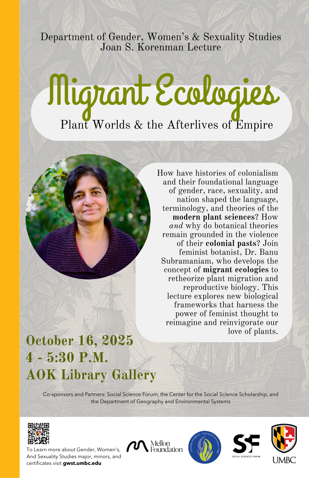 How have histories of colonialism and their foundational language of gender, race, sexuality, and nation shaped the language, terminology, and theories of the modern plant sciences? How and why do botanical theories remain grounded in the violence of their colonial pasts? Join feminist botanist, Dr. Banu Subramaniam, who develops the concept of migrant ecologies to retheorize plant migration and reproductive biology. This lecture explores new biological frameworks that harness the power of feminist thought to reimagine and reinvigorate our love of plants.