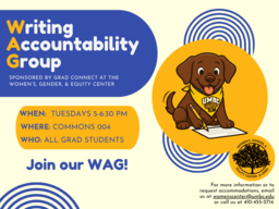 Join us for our new weekly Writing Accountability Group (WAG) - sponsored by Grad Connect at the Women's, Gender, & Equity Center! This event is for any graduate student who is working on a long-term writing project (e.g., thesis, dissertation, candidacy portfolio, manuscript) and who might be struggling with getting started, making progress, or who just needs some extra peer support during their writing process. The WAG will take place in Commons 004 from 5-6:30pm every Tuesday.