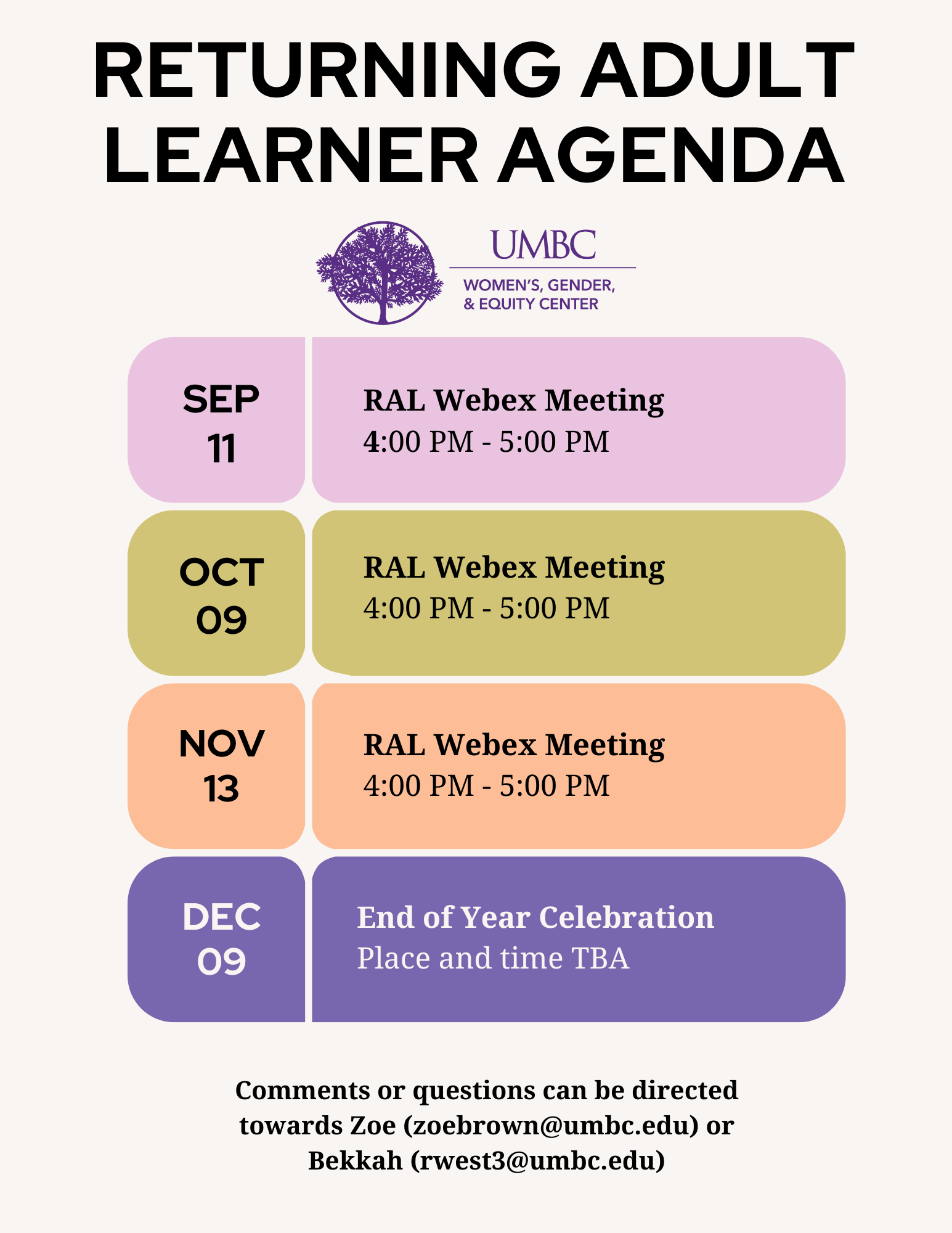 This program is designed to support undergraduate students over the age of 25 returning to college later in life. Students receiving a returning adult learner scholarship are required to participate in this program designed to support their personal, academic, and career goals of adult learners at UMBC.All adult learners at UMBC are invited to attend the monthly meetings and workshops designed specifically to meet the needs of adult students. All workshops and events are posted via our myUMBC events page.