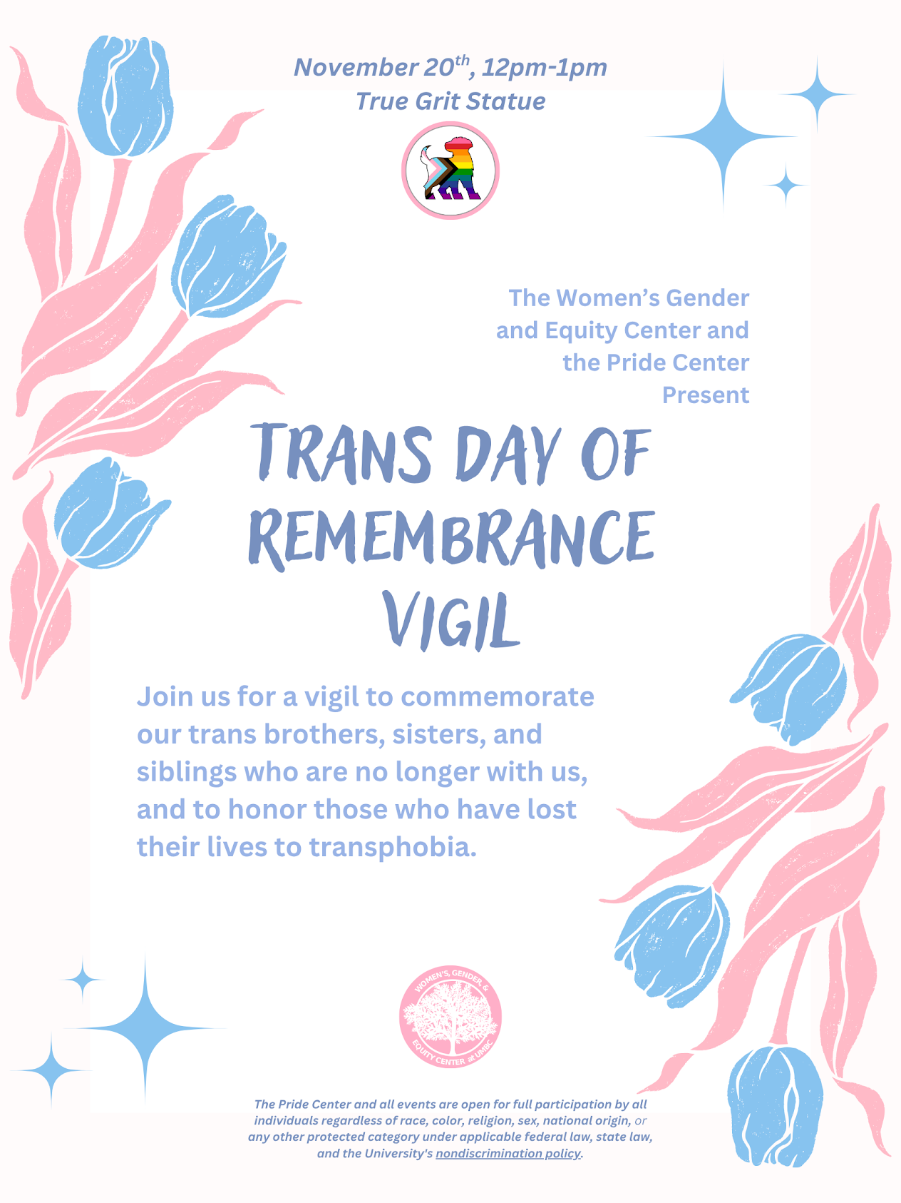 Join the Women's, Gender, and Equity Center and the Pride Center as we hold a vigil in observance of Trans Day of Remembrance on Thursday, November 20th 12-1PM at the True Grit status to gather and honor the trans lives lost this past year.