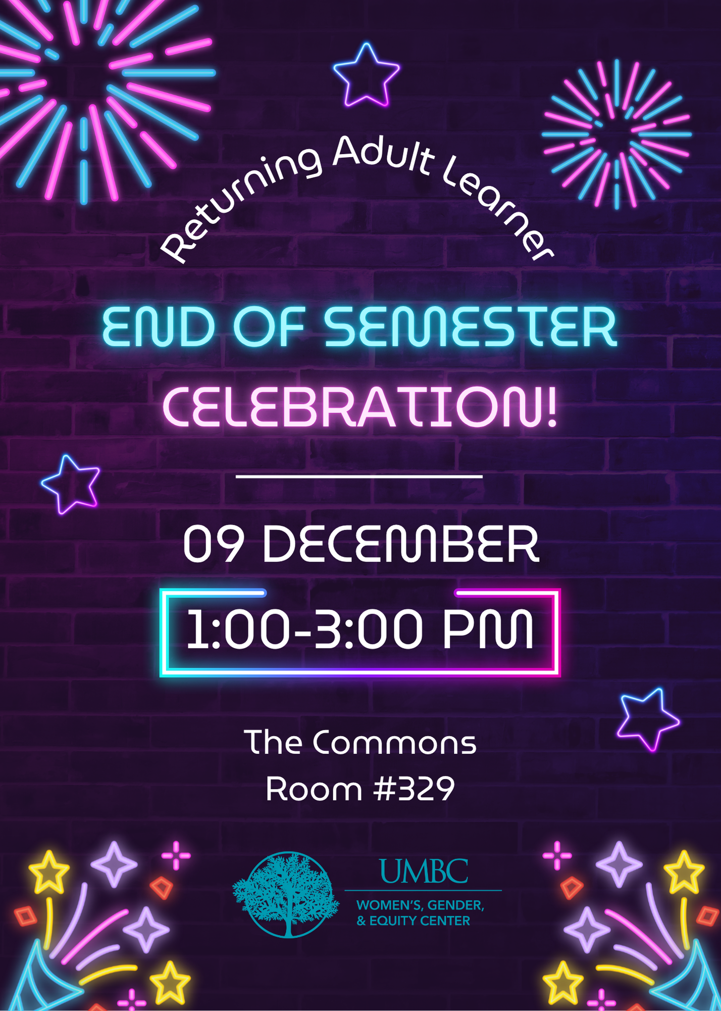 On Tuesday, December 9th, the last day of classes, from 1:00-3:00 PM we will hold our Returning Adult Learner End of Semester Celebration! This will take place in the Commons room #329, and food will be provided. We will celebrate Returning Adult Learners who are graduating this semester and acknowledge all of your hard work as the semester comes to a close!