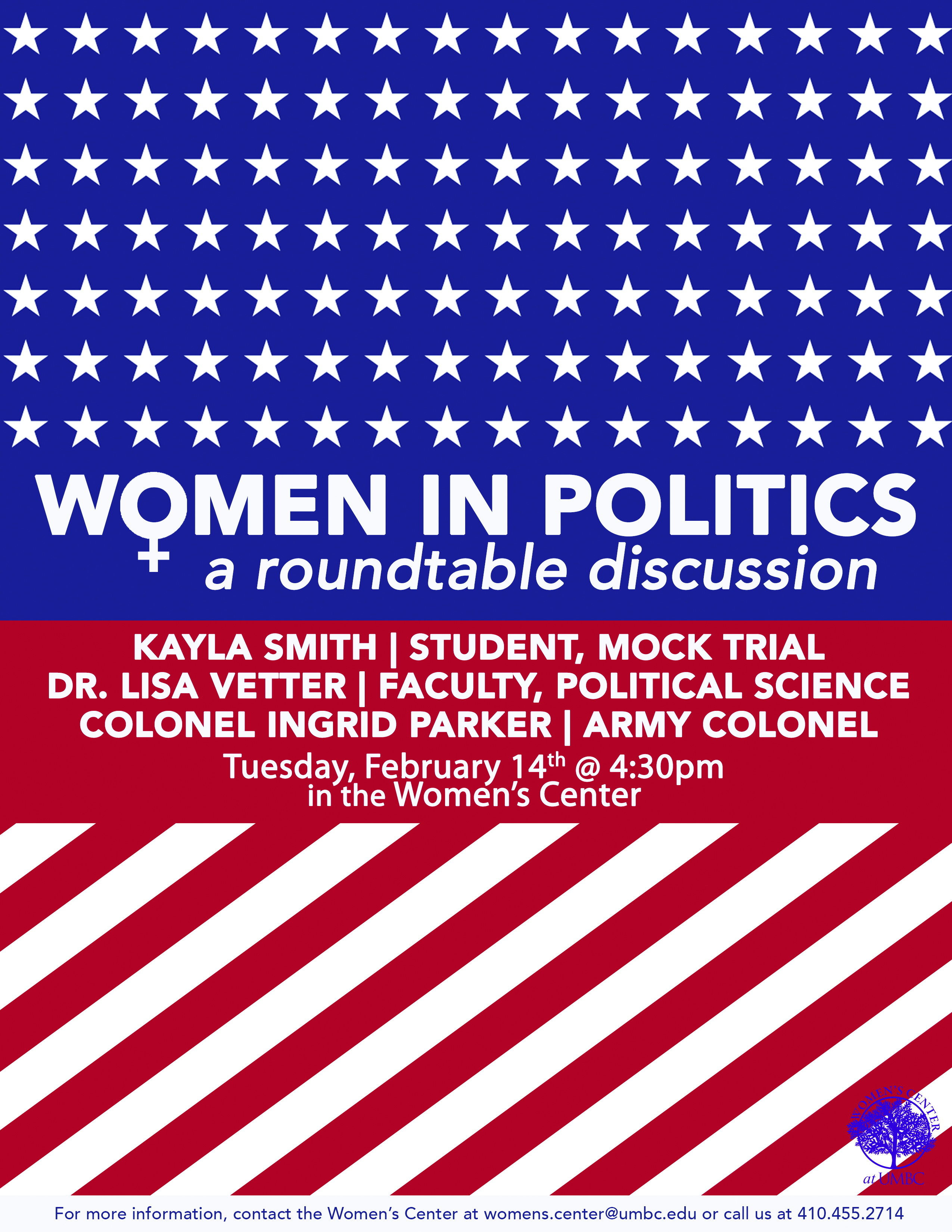 Join the Women’s Center and our guest panelists Dr. Lisa Vetter (Political Science), Colonel Ingrid Parker (LLC Student), Kayla Smith (INDS major, Mock Trial competitor).
